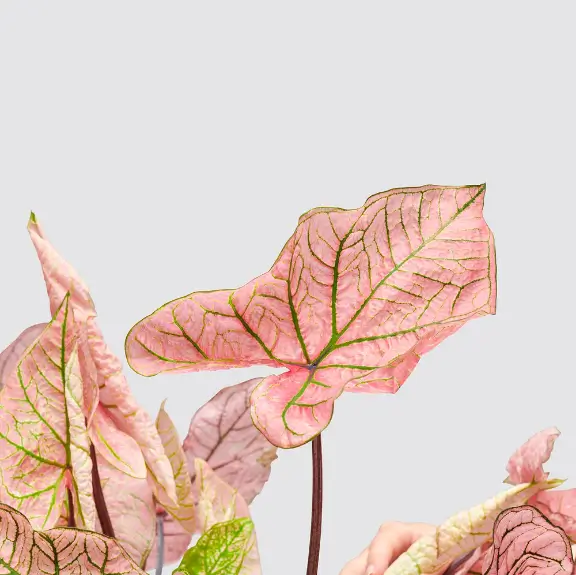 With heart-shaped leaves splashed in soft pink and lush green, Caladium ‘Spring Fling’ brings a tropical, painterly charm to any indoor space. She’s a warmth-loving beauty who thrives with a bit of extra care and consistency.